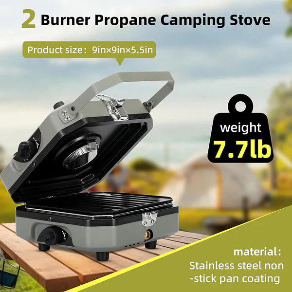 Take your outdoor meals to the next level with TheGlimjoy 2-Burner Foldable Propane Camping Stove! Compact, lightweight, and easy to set up, this powerhouse delivers reliable heat and even cooking—wherever the trail takes you. Folds flat for easy packing, yet unfolds into a rugged, wind-resistant cooking station. Perfect for outdoor camping, tailgating, or backyard BBQs.
